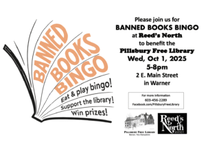 Join us at Reed’s North Restaurant, 2 East Main St. In Warner on Wednesday Sept. 18 between 5 and 8 pm for a Library fundraiser and a round of free Banned Books Bingo! A portion of all meal sales including takeout between 5 and 8 pm will be donated to the library by Reed’s North.